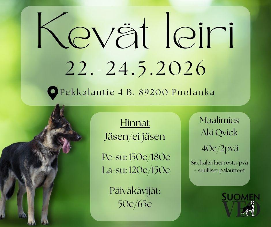 🌿 Suomen VEO ry järjestää kevätleirin 22.–24.5.2026 Puolangalla upeiden vaaramaisemien keskellä, Auhon lomarannalla! 🌿 🐶 Kouluttajana toimii Eeva Ojanperä, eläintenkouluttaja AT. ✔️Eeva pitää…